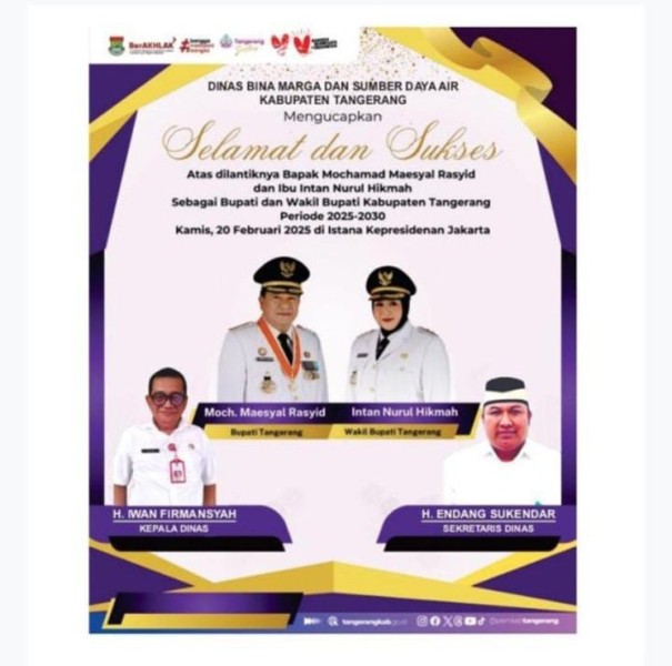 Dinas Bina Marga dan Sumber Daya Air (DBM-SDA) Kabupaten Tangerang mengucapkan Selamat dan Sukses atas di lantik Bapak Mochammad Maesyal Rasyid dan Ibu Itan Nurul Hikmah sebagai Bupati dan Wakil Bupati Kabupaten Tangerang priode 2025-2030 Februari 2025 di Istana Kepresidenan di Jakarta.
